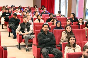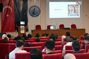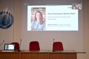 The guest speaker, Gökçe Gültekin, Career Consultant at Hollaminds Coaching & Consultancy, delivered an informative presentation for students seeking to pursue education, internships, and career opportunities in Europe.