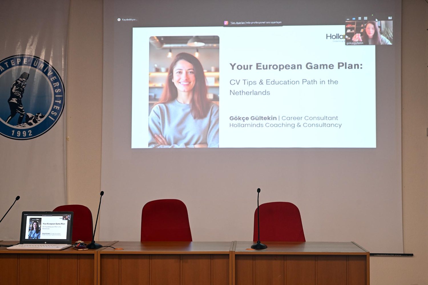 The guest speaker, Gökçe Gültekin, Career Consultant at Hollaminds Coaching & Consultancy, delivered an informative presentation for students seeking to pursue education, internships, and career opportunities in Europe.